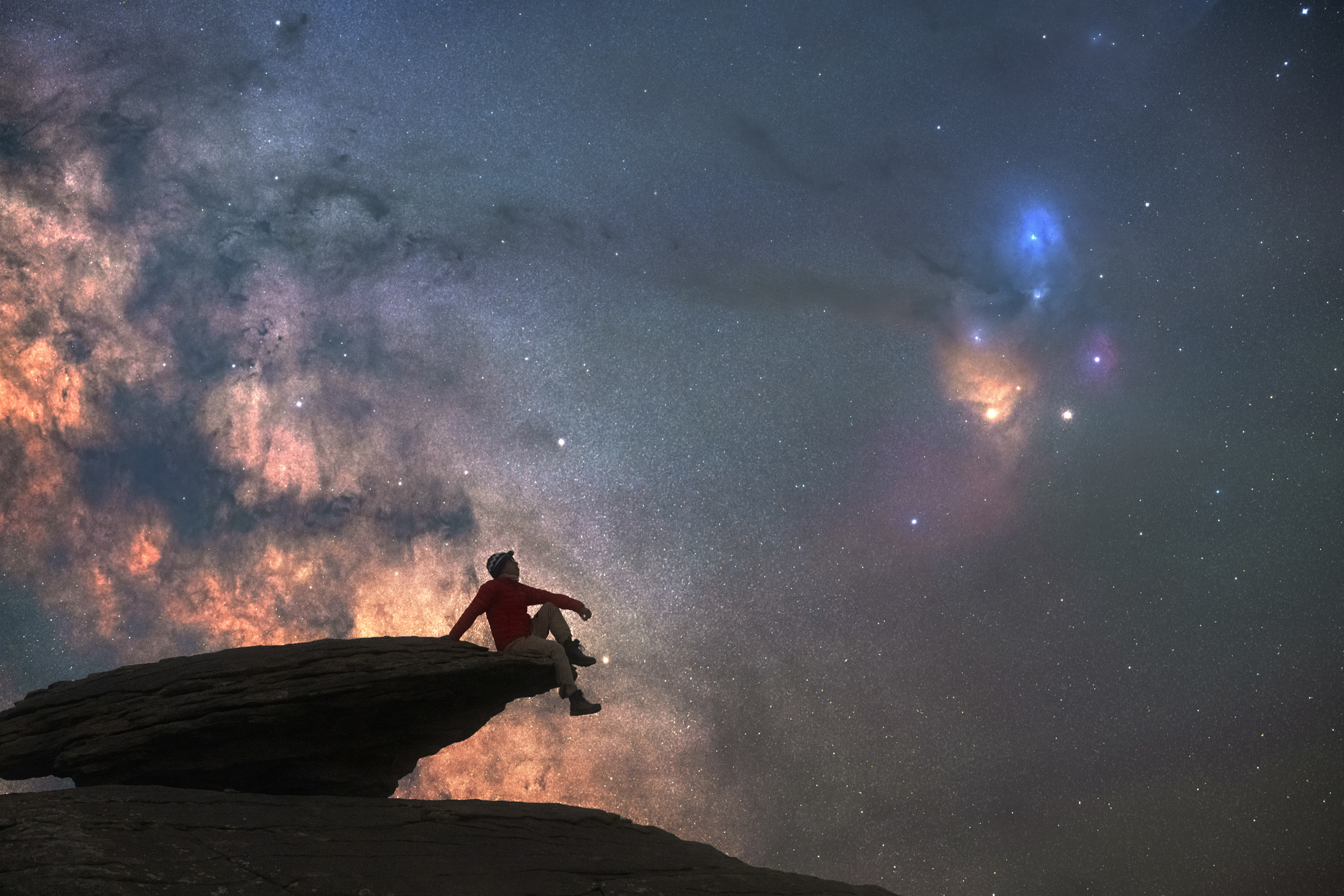 细品许晓平的作品,很有个人风格:悬崖边上的人、冰面上的拍摄者、海滩旁沙滩椅上的观星人、森林木屋前的提灯者……人和星空,在许晓平的作品同框。“每次站在夜色里,抬头仰望星空的时候,能够让自己变得心情平和。”拍摄中,许晓平总会给自己留下一些时间,与静谧的星空相处,让自己可以静静地看一看头顶的这一片穹顶宇宙。